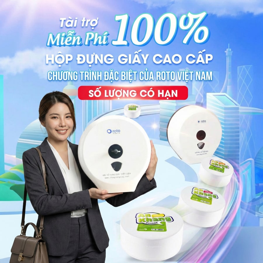 Roto Việt Nam tài trợ miễn phí hộp đựng giấy cho khách hàng tổ chức có nhu cầu sử dụng lớn như tòa nhà, văn phòng, nhà hàng, khách sạn, trường học, nhà máy. Khi đặt mua giấy vệ sinh cuộn lớn sẽ được tặng kèm hộp đựng để giấy phù hợp, giúp chuẩn hóa khu vực vệ sinh gọn gàng – sạch sẽ – chuyên nghiệp, đồng thời tối ưu chi phí vận hành về lâu dài.