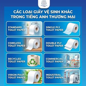 Bên cạnh việc tìm hiểu giấy vệ sinh cuộn lớn tiếng anh là gì, việc nắm rõ các thuật ngữ tiếng Anh khác liên quan đến giấy vệ sinh sẽ giúp bạn đọc hiểu chính xác catalogue sản phẩm, thông số kỹ thuật, báo giá và tài liệu thương mại quốc tế, đặc biệt trong môi trường B2B.